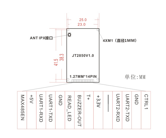 JT-2850 Είναι μια μικρή, εξαιρετικά χαμηλής ισχύος μονάδα ανάγνωσης/εγγραφής που υποστηρίζει το πρωτόκολλο ISO 18000-6C. Είναι συμβατή με κεραμική κεραία 40x40mm και μπορεί να διαβάσει συνηθισμένες λευκές κάρτες. Η μετρούμενη τιμή μπορεί να φτάσει τα 60~80cm.Μπορεί εύκολα να ενσωματωθεί σε φορητά τερματικά όπως tablet και PDA για να υλοποιηθεί η λειτουργία επέκτασης RFID τέτοιων συσκευών και χρησιμοποιείται ευρέως σε άλλους τομείς όπως η διαχείριση logistics, η επιθεώρηση ποιότητας προϊόντων, η διαχείριση προσωπικού και ούτω καθεξής.